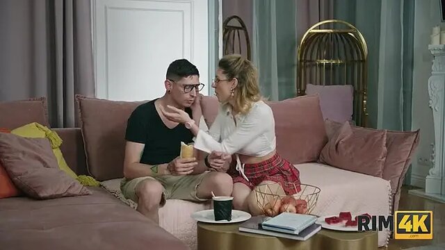 A hot blonde babe with glasses and stockings is enjoying a rimjob, eagerly licking her partner's ass. She then turns around, ready to give a handjob to his rock-hard rod. This slim, kink-loving slut will satisfy all your desires in this rimming rampage!